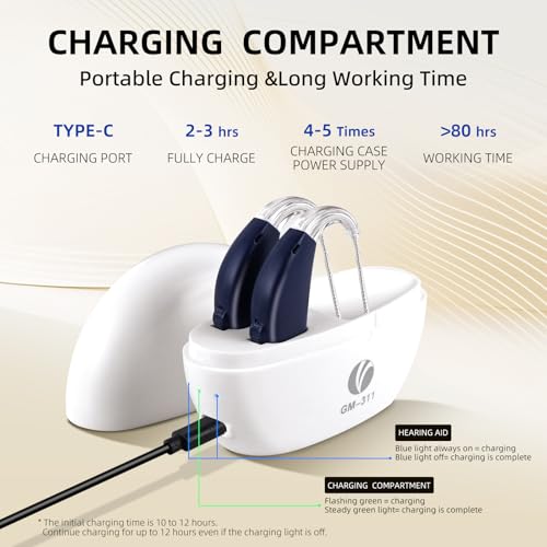 • Quick Charging: VCOM rechargeable hearing aids offer up to 9 hours of battery life on a single charge in hearing aid mode. With no need to replace batteries, the charging case takes only 60 minutes to fully charge. The case can fully charge both aids up to three times, giving you about 28 hours of use.