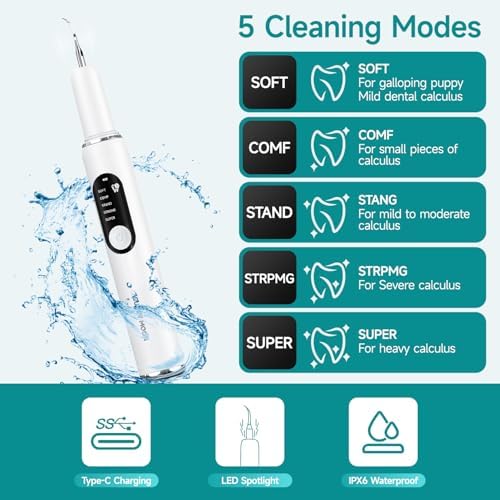 • 🌵【5 Cleaning Modes & High-brightness ring light】Thedog plaque and tartar remover features five working modes: Gentle, Comfort, Standard, Strong, and Super Strong. You can customize oral care based on your pet's needs, first-time users are recommended to select the 'soft' mode. Our dog tartar remover for teeth and tartar remover for teeth is also cat teeth cleaning equipped with a high-brightness ring light, illuminating blind spots within the oral.