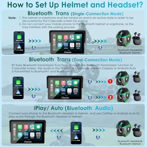 - 【Built-in Dual Bluetooth】 Carpuride W502S Motorcycle GPS carplay features built-in Dual Bluetooth connectivity, pair the carplay touch screen with your smartphone and Bluetooth-enabled headphones or helmet, you can make hands-free calls or enjoy your favorite music, without take off your helmet. The convenience of dual Bluetooth seamless connection not only keeps your phone safely in your pocket but also allows you to enjoy a free riding experience.