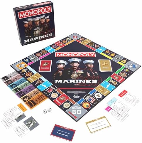 - OFFICIAL USMC GAME: Licensed MONOPOLY edition celebrates Marine Corps legacy with customized board, cards, and pieces.
