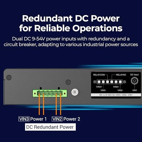 - Has two wide voltage DC 9-54V power inputs and a circuit breaker, ensuring continuous operation. A DC power adapter is also included.