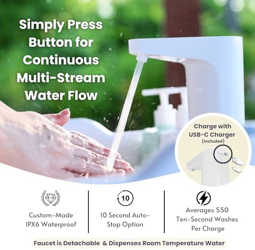 - ELECTRONIC FAUCET – Just press a button for continuous, consistent water flow at the perfect pressure – ideal for washing food, tools, dishes, and more