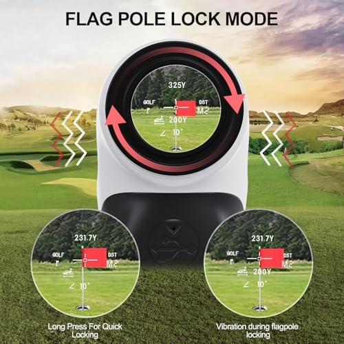 - Flagpole Lock: Our range finder golf allows you to lock on the flag up to 300 yards. When the laser locks on the flag, short press the power button and our golf rangefinder will vibrate briefly to confirm that the target has been locked, which is very suitable for golf beginners