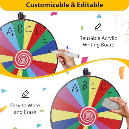 - 【Fully Customizable & Creative】- Featuring 18 customizable slots, the prize wheel allows you to personalize the template with your logo, text, or prizes. The reusable acrylic writing board makes it easy to write, erase, and even attach pictures, unleashing your creativity for any event