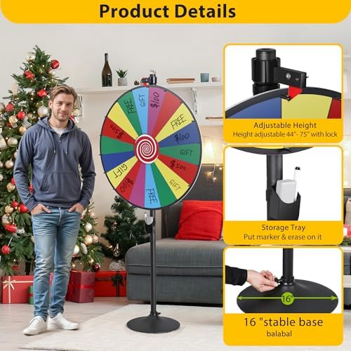 Smartxchoices 36" Spinning Prize Wheel: Your Ultimate Event Catalyst Engineered for event planners and game masters who demand reliability, this commercial-grade prize wheel transforms any space into an engagement hotspot – from trade show booths to birthday parties. Why Professionals Choose Us: - Dual-Use Design: Adjust height from 28" (desktop) to 48" (floor) via telescopic legs. Non-slip feet grip concrete, grass, or carpets, ideal for outdoor carnivals. - 360°Silent Spin: Industrial ball bearings eliminate jerky stops. Tested for 100,000+ spins. - Instant Customization: Write prizes/logo on 18 slots with included odorless markers. Wipe clean in 5 seconds – no residue vs. paper labels Specifications: Size: 36" Diameter Weight: 16 lbs Height: 44" - 75" Materials: Aluminum Frame, ABS Slots, Pvc