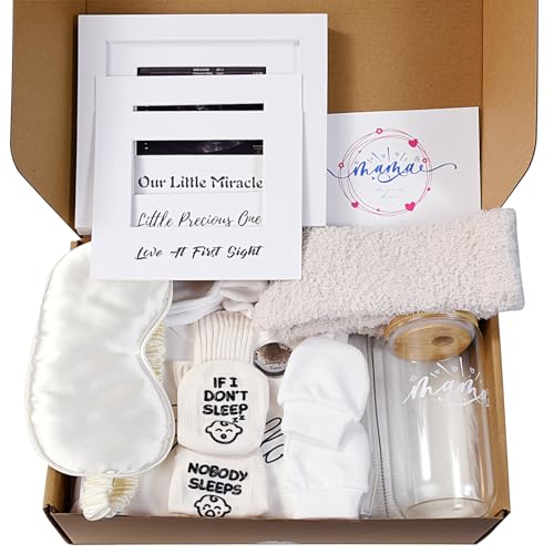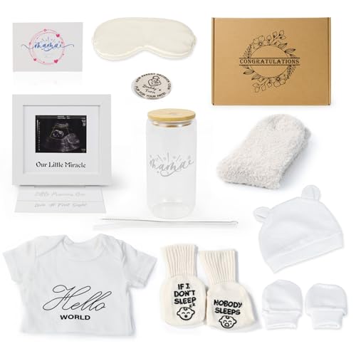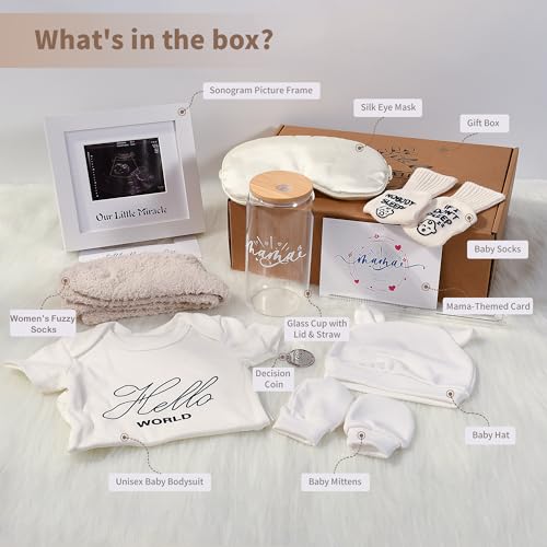 - 【Pregnancy Gifts Basket】This charming gift box includes: 1 Unisex Baby Bodysuit, 1 Baby Gloves, 1 Baby Mittens, 1 Baby Hat, 1 Silk Eye Mask, 1 Women's Fuzzy Socks, 1 Glass Cup with Lid & Straw, 1 Sonogram Picture Frame, 1 Decision Coin, 1 Mama-Themed Card and 1 beautifully packaged gift box. This set includes everything newborns and their parents need.