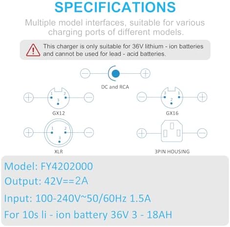 - 7-in-1 Professional Connections – Fit Most Charging Ports: Comes with 7 precision-matched adapters (GX12, GX16, RCA, DC 2.5/2.1mm, XLR, 3PIN HOUSING) to solve interface mismatches. Each connector’s size is clearly labeled (e.g., GX12: 9mm, DC 2.5mm: self-contained), ensuring quick identification for hoverboards, electric scooters, and other 36V devices. Say goodbye to incompatible plugs!