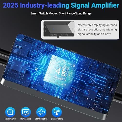 - 𝐃ual-𝐌ode 𝐀mplifier 𝐁ooster: Gain complete control over your tv signal with our detachable amplifier of indoor tv antenna. Strategically switch between Long-Range and Short-Range modes to perfectly match your distance from broadcast towers. When it isn't needed, simply detach the booster for a direct, clean signal. This smart IC chip of antenna for smart tv works to dynamically pull in more channels while filtering out up to 80% of signal interference, guaranteeing a crystal-clear, rock-solid 4K HD stream regardless of challenging weather conditions
