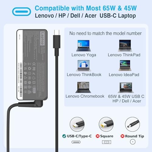 - Universal Compatibility: perfect match most 65W 45W USB-C laptop without error message popup, needn’t to check the model, widely compatible with Lenovo ThinkPad A275.. E480, E580, E14, E15, E16.. T480, T490, T580, T14, T14s, T15, T16.. R480.. ThinkPad 13 13s X13 X12, X1 Carbon / Tablet / Yoga / Fold / Nano / Titanium; Yoga 6 7 9 7i 9i.. 720, 730, 920, C740, C930, C940..; Chromebook 100e 300e 500e.. N23 Yoga / Flex 11 / 11e...