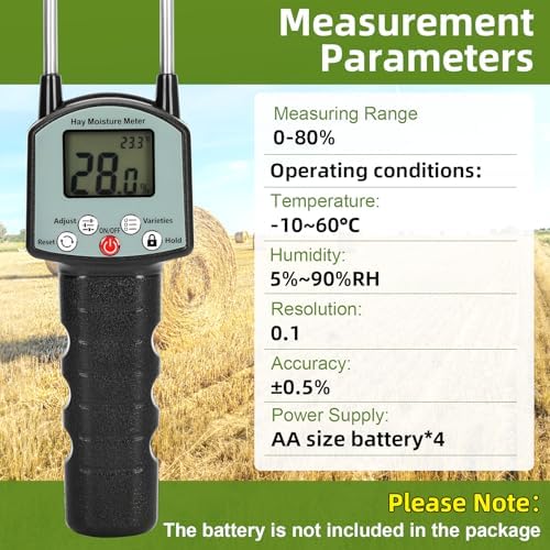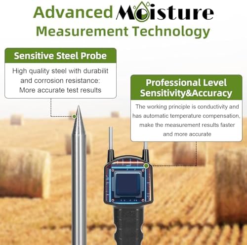 - 【Precise and Fast】Our upgraded TK100H portable hay moisture tester has an error range of only 0.5%, provide accurate and fast readings within the moisture range of 0-80%. Hay moisture meter can ensure that your hay is baled at the correct time, avoiding situations where the hay is not dry enough or too dry when baled, making it very suitable for farmers, ranchers, and hay producers.