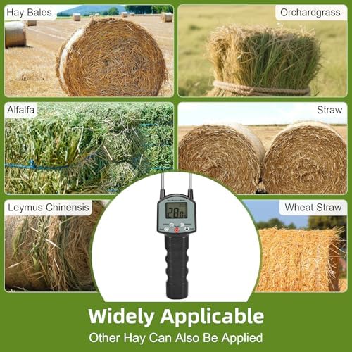 - 【Generally Applicable】This moisture meter for hay suitable for all common hay types (alfalfa, grass, orchard grass, sheep grass, etc.) and related materials such as straw, wood fiber, and bran. When using this hay tester probe, please insert the probe straight into the haystack. The deeper the probe is inserted, the more accurate the value will be.