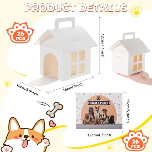 LOVYNO 26 Pcs Dog Party Favor Boxes with Pet Adoption Certificate, Dog House Shape Treat Gift Boxes with Holes, Adopt A Puppy Party Supply Boxes for Boys Girls Pet Adoption Theme DIY Crafting Party