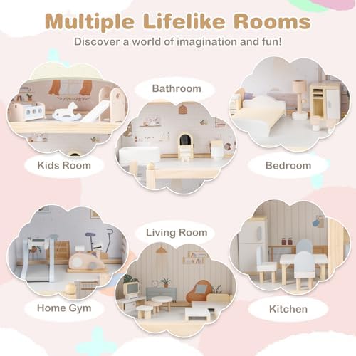 - Diverse Play Scenarios: Discover a world of imagination and fun with our 4-story HONEY JOY doll house, featuring 6 lifelike rooms including a kids room, bathroom, bedroom, home gym, living room, and kitchen. The wooden dollhouse also features an outdoor balcony with a pool and sunshade for added fun.