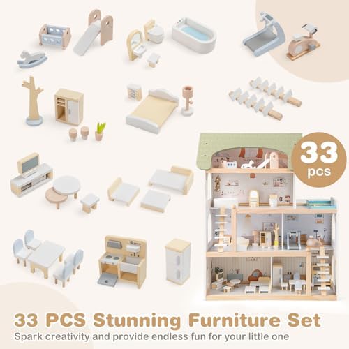 - 33 PCS Stunning Furniture Set: The doll house comes with 33 pieces of furniture that can be rearranged to suit your child’s preference. Features such as doors that open on the kitchen oven, refrigerator, and a toilet lid uplift the realism, while movable stairs enhance the interactive play.