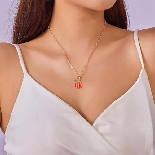 Dtja Rhinestone Pumpkin Pendant Necklace for Women Gold-Tone Fashion Enamel Halloween Thanksgiving Green Leaf Charms Link Chain Adjustable Cute Fall Holiday Festival Jewelry Gift Souvenir 18"