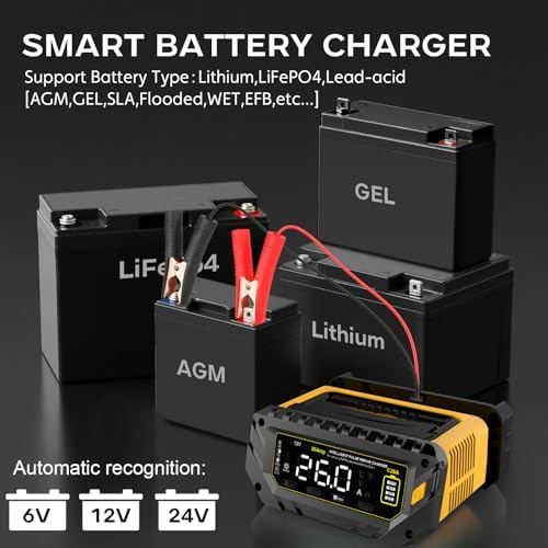 26 AMP Car Battery Charger, 6V/12V/24V Lead-Acid, Lithium, LiFePo4 Smart Battery Charger, Large Screen Trickle Charger, Fully Automatic Chargers and Maintainer for Car, Motorcycle, Lawn Mower