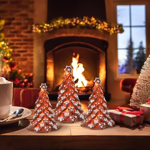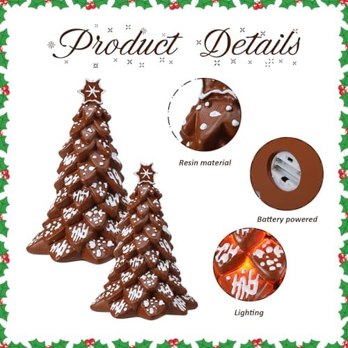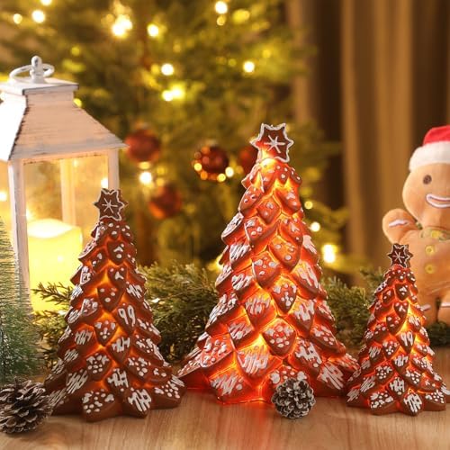 3 Pack Gingerbread Christmas Tree with Light Figurines Christmas Tabletop Decorations Resin Gingerbread Cone Tree Decor Figurines for Xmas Home Centerpieces Tiered Tray
