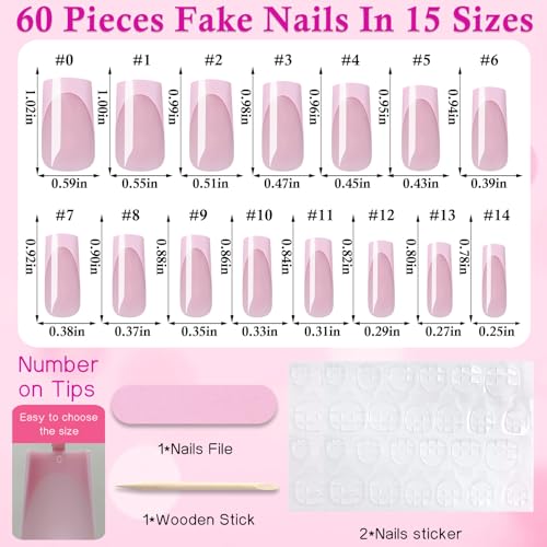 60pc Pink French Tip Press on Nails Medium & Square Fake Toenails Kit, Square Nails Press ons Toenail Women French Acrylic Nail Medium Glue on Nails Toenail Tips Toe Fake Nail with Tabs File