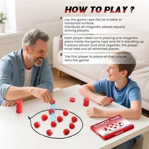 - How to Play: Distribute all magnetic pieces equally among players.Each player takes turns placing one magnetic piece inside the game rope.If the pieces stuck together, the player must take out all stuck together pieces. The first player to place all their pieces wins!