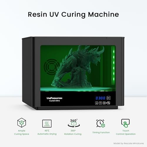 - 360° All-Around Uniform Curing for 3D Printing: The Cure3 Ultra curing machine is equipped with 4 light strips, featuring a total of 24 light beads arranged for full-coverage exposure. The multi-directional irradiation, combined with the built-in 360° rotating platform, ensures optimal exposure on every angle of the 3D model, delivering a flawlessly cured finish. The default curing time is 3 minutes, but it can be freely adjusted from 0 to 30 minutes to meet your needs.