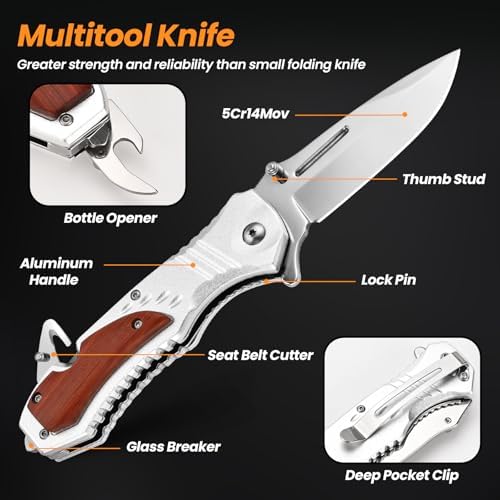 Pocket Knife for Men, Silver Multitool Folding Knife with Bottle Opener, Glass Breaker, Seatbelt Cutter for Camping, Hunting, Everyday Carry, Anniversary Birthday Gifts for Him Men Husband