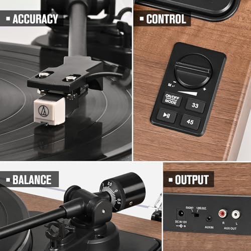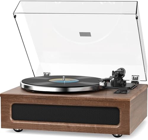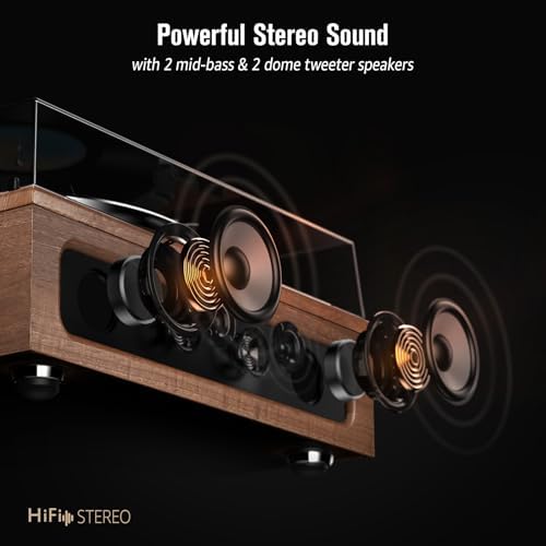- [All-in-One Belt Drive Turntable] Turntable built-in four full-range HiFi stereo speakers with 33⅓ and 45 RPM speeds, it can play all of 7" 10" 12" vinyl records, supports BT input streaming music from other devices wirelessly. Built-in amplifier allows RCA connection to your own externally-powered/active speakers.