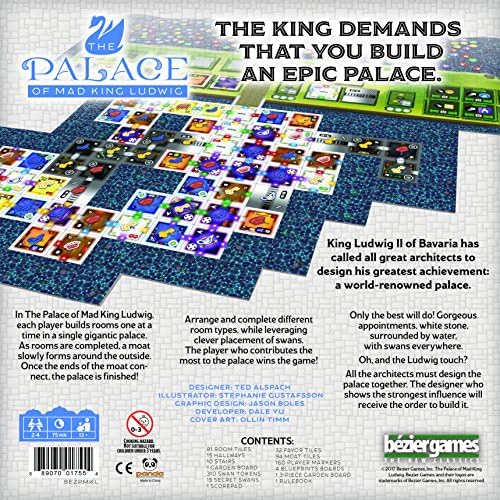 El Rey Ludwig II de Baviera ha convocado a todos los grandes arquitectos para diseñar su mayor logro: un Palacio de renombre mundial. ¡Solo los mejores serán aceptados! Adornamientos espléndidos, piedra blanca, rodeado de agua, con cisnes por todas partes. Ah, y el toque de Ludwig: ¡todos los arquitectos deben diseñar el Palacio juntos! El diseñador que muestre la mayor influencia recibirá el encargo de construirlo. En el Palacio del Loco Rey Ludwig, cada jugador construye habitaciones una a una en un solo Palacio gigantesco. A medida que se completan las habitaciones, un foso se forma lentamente alrededor del exterior. Una vez que los extremos del foso se conectan, ¡el Palacio está terminado! ¡Organiza y completa diferentes tipos de habitaciones, aprovechando la colocación inteligente de los cisnes! ¡El jugador que más contribuya al Palacio gana el juego!