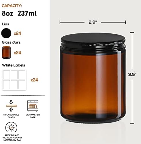 Paquete de 24 frascos de vidrio ámbar de 8oz con tapas negras - Para hacer velas, almacenamiento de alimentos, enlatado, especias, líquidos - herméticos y aptos para lavavajillas